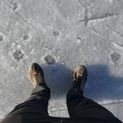 Sur la fin du sentier du Cerro Torre, je me suis aventurer sur le lac. Avec un gèle conséquent et 30 bons centimètres de poudreuse ça ne présentait aucun danger... Sauf quand, au milieu du lac, j'entends comme un bruit d'eau. J'avance d'un pas, le bruit s'écoute de nouveau. Encore un pas et rebelote ! Ce pourrait-il que la glace... dans un vent de panique je me mets courir pour regagner le bord du lac avant d'entendre de nouveau ce même bruit sur la terre ferme. C'était juste l'eau de ma bouteille qui remuait à chaque mouvement. Heureusement que le ridicule ne tue pas...
